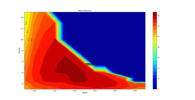 電力驅(qū)動系統(tǒng)是電動車的心臟,其性能的優(yōu)劣會直接影響電動車的整車性能,內(nèi)置式電驅(qū)系統(tǒng)功率密度大,驅(qū)動效率高。高效的MAP圖對樣機的設(shè)計及整車的性能分析提供了數(shù)據(jù),通過電機的外特性及負荷特性的測試數(shù)據(jù),會自動生成效率MAP圖。