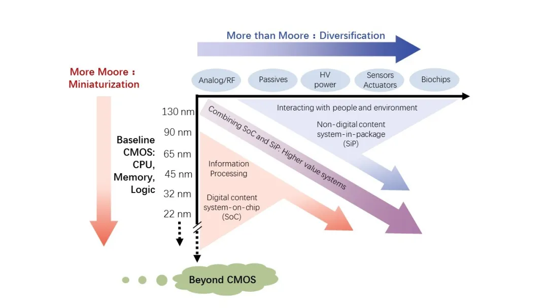 幸運的是,每當摩爾定律被唱衰將走到盡頭,總會激發(fā)出科學家和工程師們創(chuàng)新構想,提出力挽狂瀾的突破性技術,將看似走向終結的摩爾定律以“后摩爾定律”的形式延續(xù)下去?!昂竽柖伞钡膶嵸|是,它除了會延續(xù)摩爾定律對集成度、性能的追求外,還會利用更多的技術,例如模擬/射頻、高壓功率電源、MEMS傳感器、生物芯片技術及系統(tǒng)級封裝(SiP)等三維集成技術,以提供具有更高附加值的系統(tǒng)。