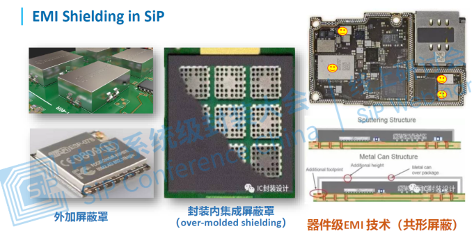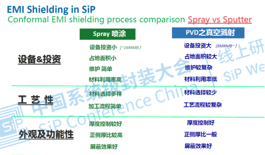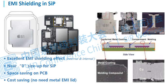 共形屏蔽技術(shù)可以解決SiP內(nèi)部以及周?chē)h(huán)境之間的EMI干擾,對(duì)封裝尺寸和重量幾乎沒(méi)有影響,具有優(yōu)良的電磁屏蔽性能,可以取代大尺寸的金屬屏蔽罩。