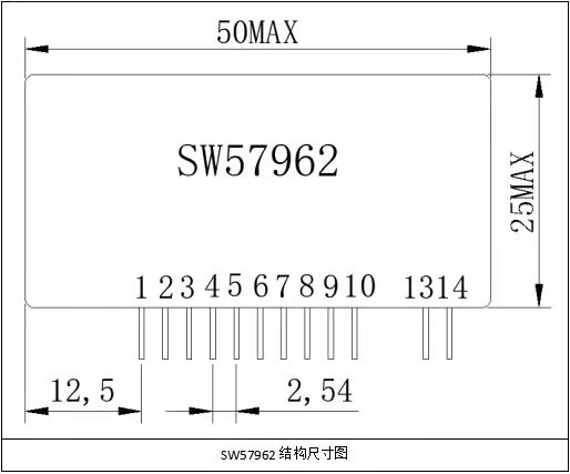SW57962的尺寸為50mm*25mm,采用SIP的管腳封裝形式,共有腳位14個(gè),其中11,12管腳為空置狀態(tài),各PIN腳之間的距離為2.54mm,各PIN腳功能定義如下: