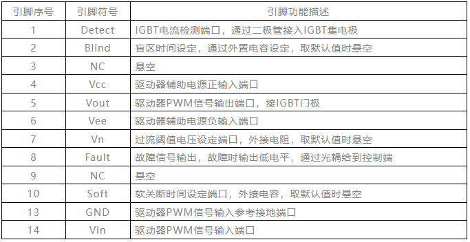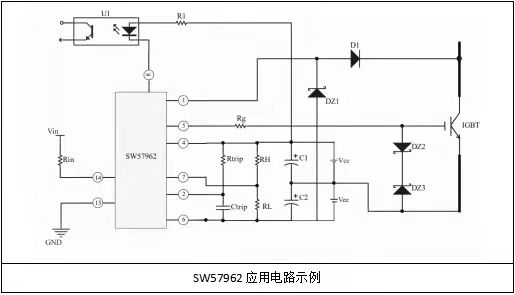 從SW57962的內(nèi)部原理功能框圖可以看出SW57962主要功能塊由四部分組成,分別是光耦隔離電路、過(guò)流檢測(cè)電路、門極關(guān)斷電路、延遲復(fù)位電路等單元組成。光耦隔離電路主要用于驅(qū)動(dòng)信號(hào)的電氣隔離及信號(hào)傳輸?shù)淖饔?;過(guò)流檢測(cè)電路用于IGBT過(guò)流信號(hào)的檢測(cè),具體閾值可進(jìn)行外部調(diào)節(jié);門級(jí)關(guān)斷電路主要作用為異常條件下對(duì)IGBT驅(qū)動(dòng)進(jìn)行關(guān)斷,同時(shí)將該異常信號(hào)輸出反饋至控制級(jí);延遲復(fù)位電路主要用于故障信號(hào)去除后進(jìn)行延遲復(fù)位,使得驅(qū)動(dòng)信號(hào)恢復(fù)正常,達(dá)到軟開(kāi)啟的效果。