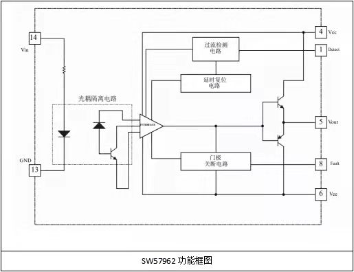 SW57962內(nèi)部采用高隔離電壓、高共模抑制比的光電隔離器,耐壓可達(dá)3750V。同時(shí)SW57962兼容TTL電平和CMOS信號(hào)兩種輸入,最高工作頻率為40KHz,同時(shí)具備過(guò)流保護(hù)、故障輸出、盲區(qū)可調(diào)、過(guò)流軟關(guān)斷、固定周期復(fù)位等完善的保護(hù)功能。